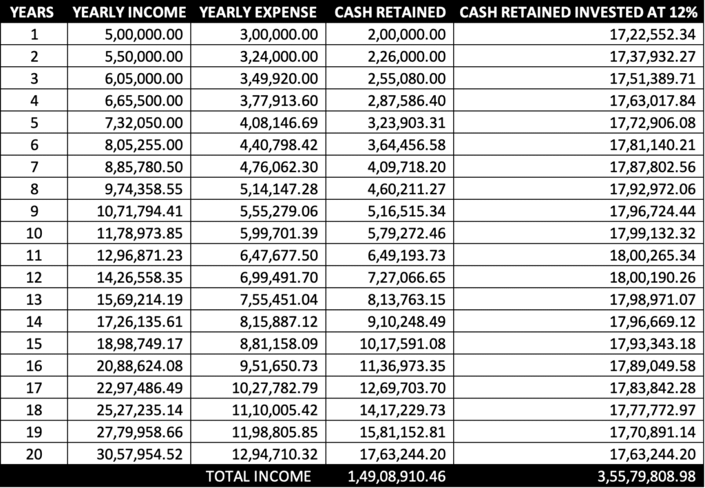 Now, let’s go back to our previous example. But this time, you invest your retained savings in assets that yield a 12% annual return—a figure you can reasonably expect without taking major risks.